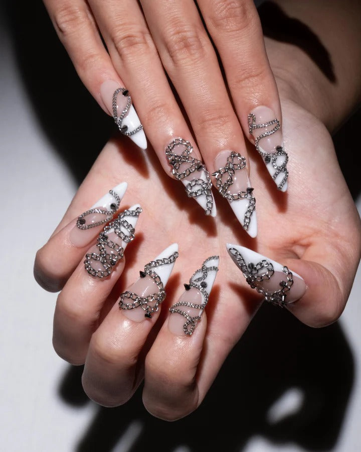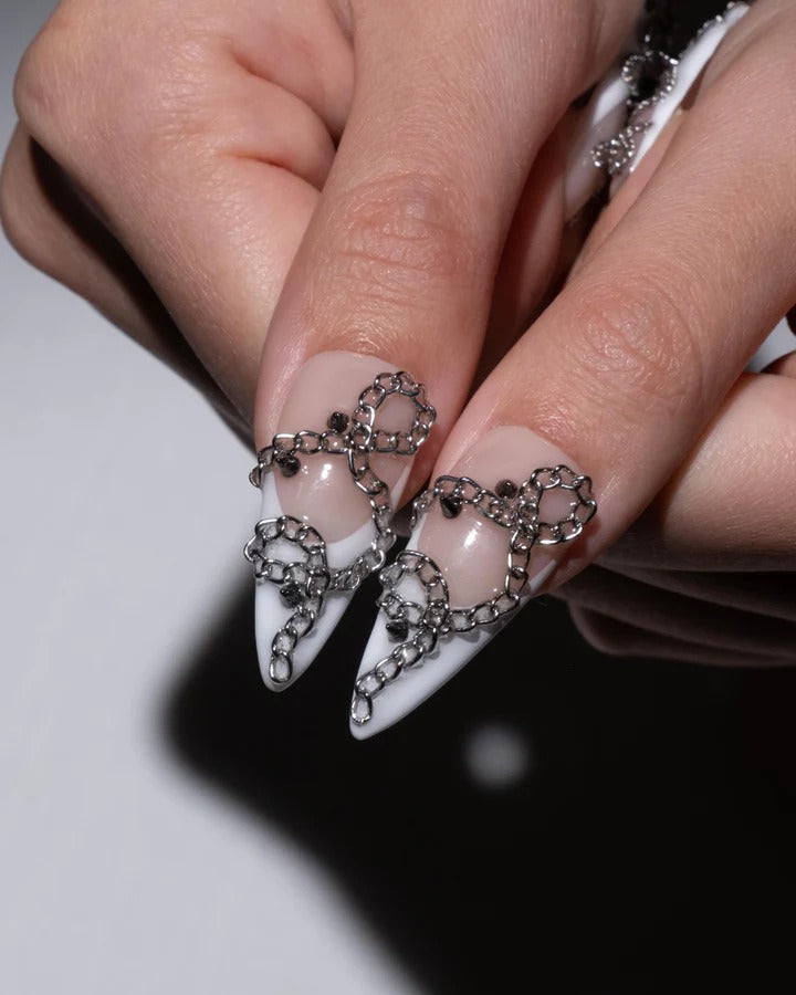 Nailcissist™ 'Chained' features a classic beige base and white french tip with scattered chain details on a bold long stiletto shape.
